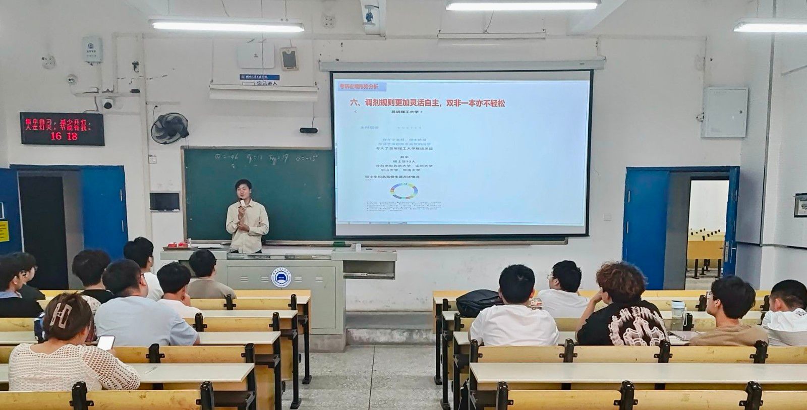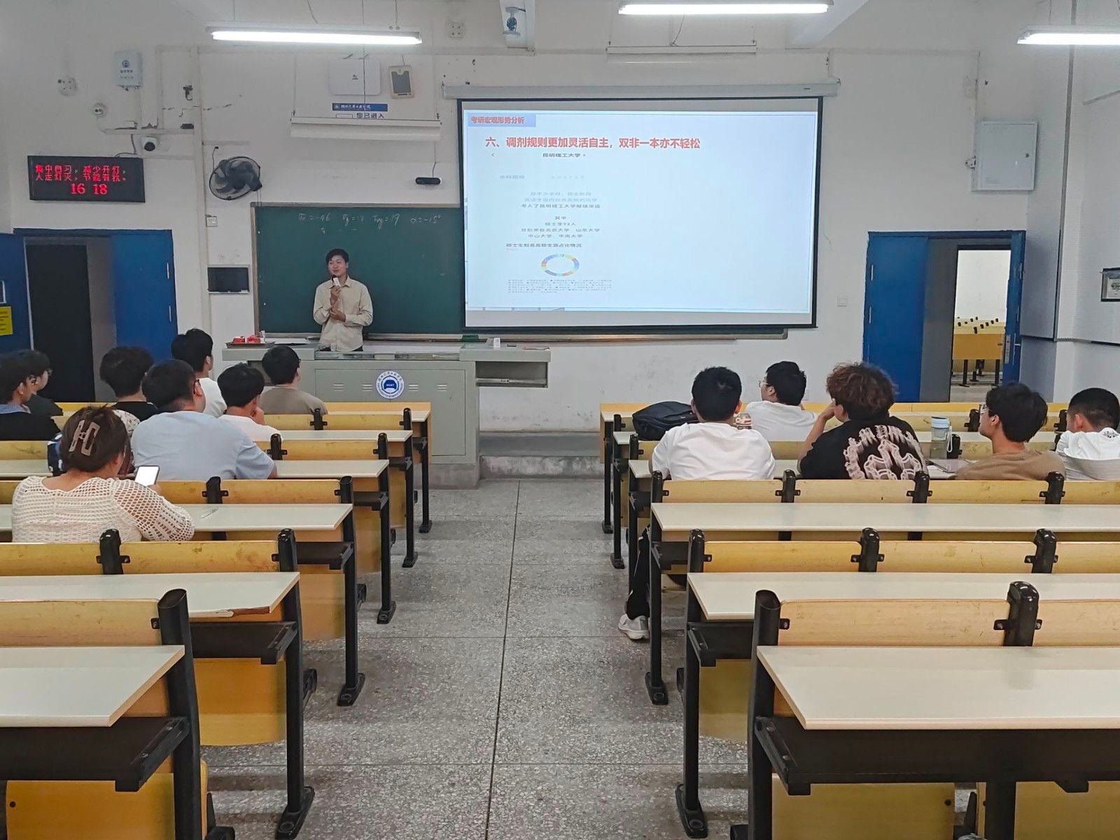 活动伊始,周家成强调考研心态的重要性,他特别强调:“良好的心态是考研路上的基石,唯有坚定信念、持之以恒,方能抵达成功彼岸。”随后,周家成系统剖析了当前考研形势与流程,深入讲解了院校专业选择的科学方法,并针对不同学科特点提出了分阶段复习建议,为同学们构建了清晰的备考框架。